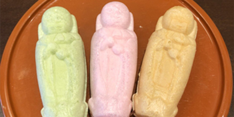 「とげぬき地蔵」の御姿をかり、つぶし・胡麻・抹茶と三色の餡を一つずつ丁寧に手作業で仕上げております。12ヶ入1050円(税込)他 お体の具合の悪い所から召し上ってみてはいかがですか?
